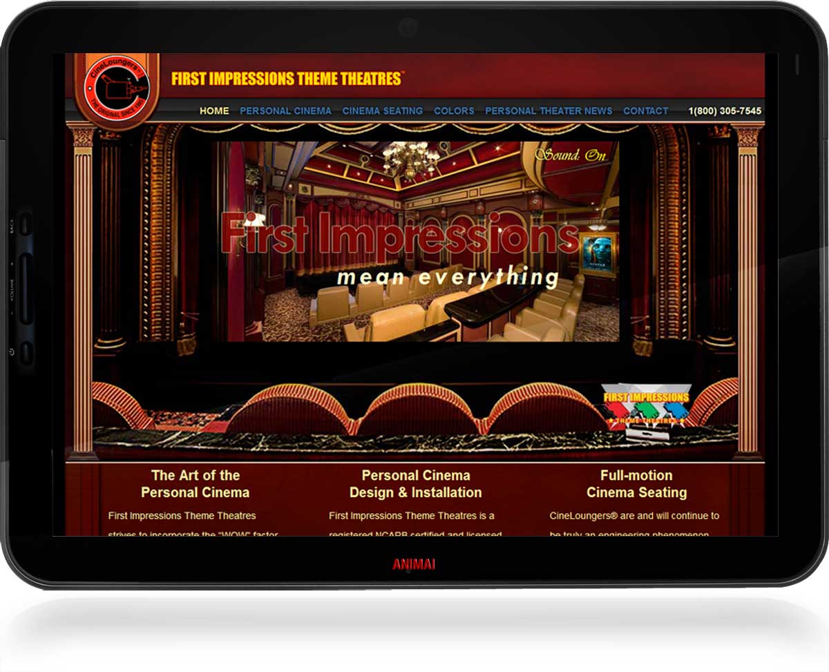 The folks at First Impressions Theme Theatres needed to improve their web presence in order to reflect their stature as one of the premiere personal cinema and million dollar home theater designers and builders in the world. The company has been featured on several installments of HGTV’s Million Dollar Rooms, High Tech Homes TV, and many design publications and trade journals. They wanted a web site that was designed to present their products and services with the same bold presence as their theaters.