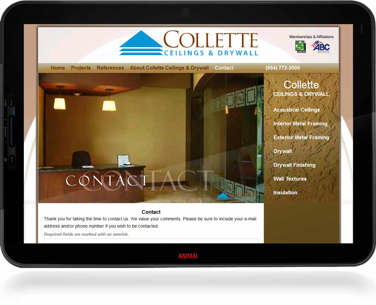 Collete Ceilings and Drywall is a sub-contractor for high-end architectural firms, interior design firms, and general contractors. Paul and Kim Collette needed a web presence in order to better market their products and services to their prospects and existing clients. They specifically requested an easy to use web site that flowed from page to page in a logical fashion. They also wanted a high end look, with restrained, custom website design that would properly represent Collette, while not overshadowing the classic and dramatic designs of their clients.